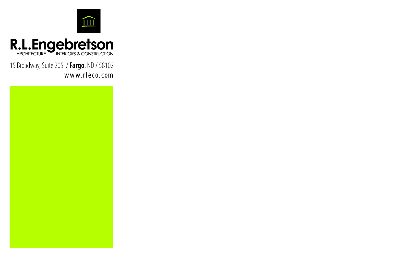 R.L.Engebretson’s old logo resembled a house so when it came time for a new look, we decided to give it a modern edge. R.L.E. is known for its architecture work so we incorporated an icon to represent a simplified building structure in a lime green color to correspond with its umbrella company, The RLE Group. The business needed marketing material to represent themselves sowe used the logo’s primary color as a nice contrast against the white.